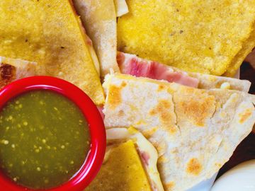 Una sincronizada de harina y una sincronizada de maíz cortadas en 4 piezas con frijoles refritos y hash brown.