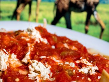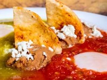Los tradicionales, cuadritos de tortilla de maíz y queso rallado con Pollo y un huevo estrellado encima, en salsa roja o verde acompañados de frijoles refritos.